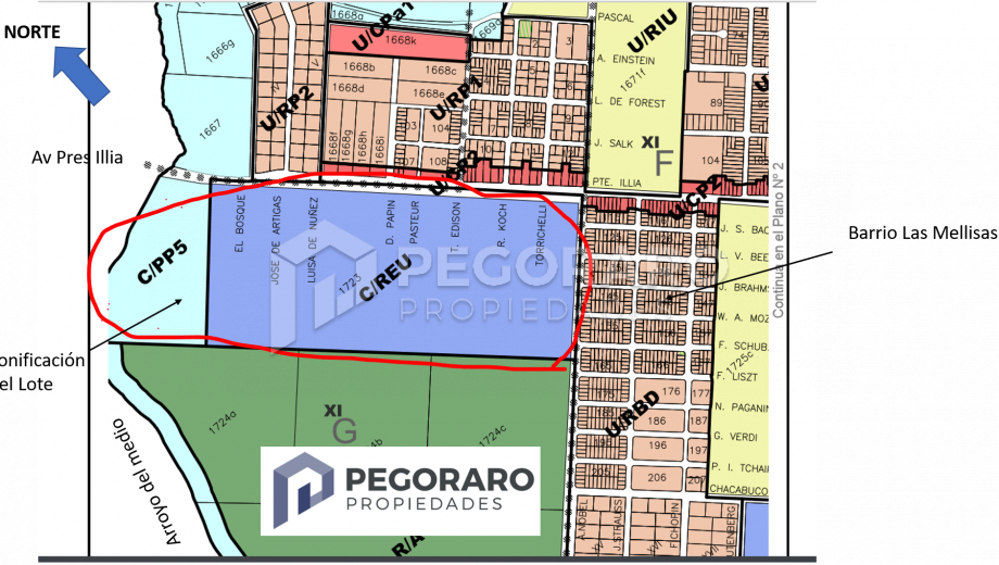 Se trata de una fracción de terreno apta para desarrollo habitacional, el cual linda al norte con el arroyo del medio (arroyo navegable que desemboca en el Rio Parana), al este con la Av Pres Arturo Illia (la cual conecta hacia el sur con el centro de San Nicolas en 5 minutos de auto y al norte con Villa Constitución), al sur con la calle Nobel lindera al barrio Las Mellizas en el cual fueron asfaltadas sus principales calles durante el año 2020, y al oeste con otra fracción de terreno. Los servicios de agua, energia, gas y cloacas llegan sobre la Av Illia. Zonificación C/PP5 sobre la zona del arroyo y C/REU sobre el resto de la fracción.
